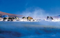 We drive up the altiplano. A succession of colored mountains receives us, before reaching Colchane, Isluga, on the Bolivian border and in the Isluga National Park. A variety of species live in this area. We set our camp at Enquelga thermal baths (3800m) at the base of Isluga Volcano (5530m). Preparation for the expedition. (B,L,D)