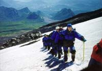 guides, boots, crampons, ice axe, windbreaker, glasses, gloves, backpack,
